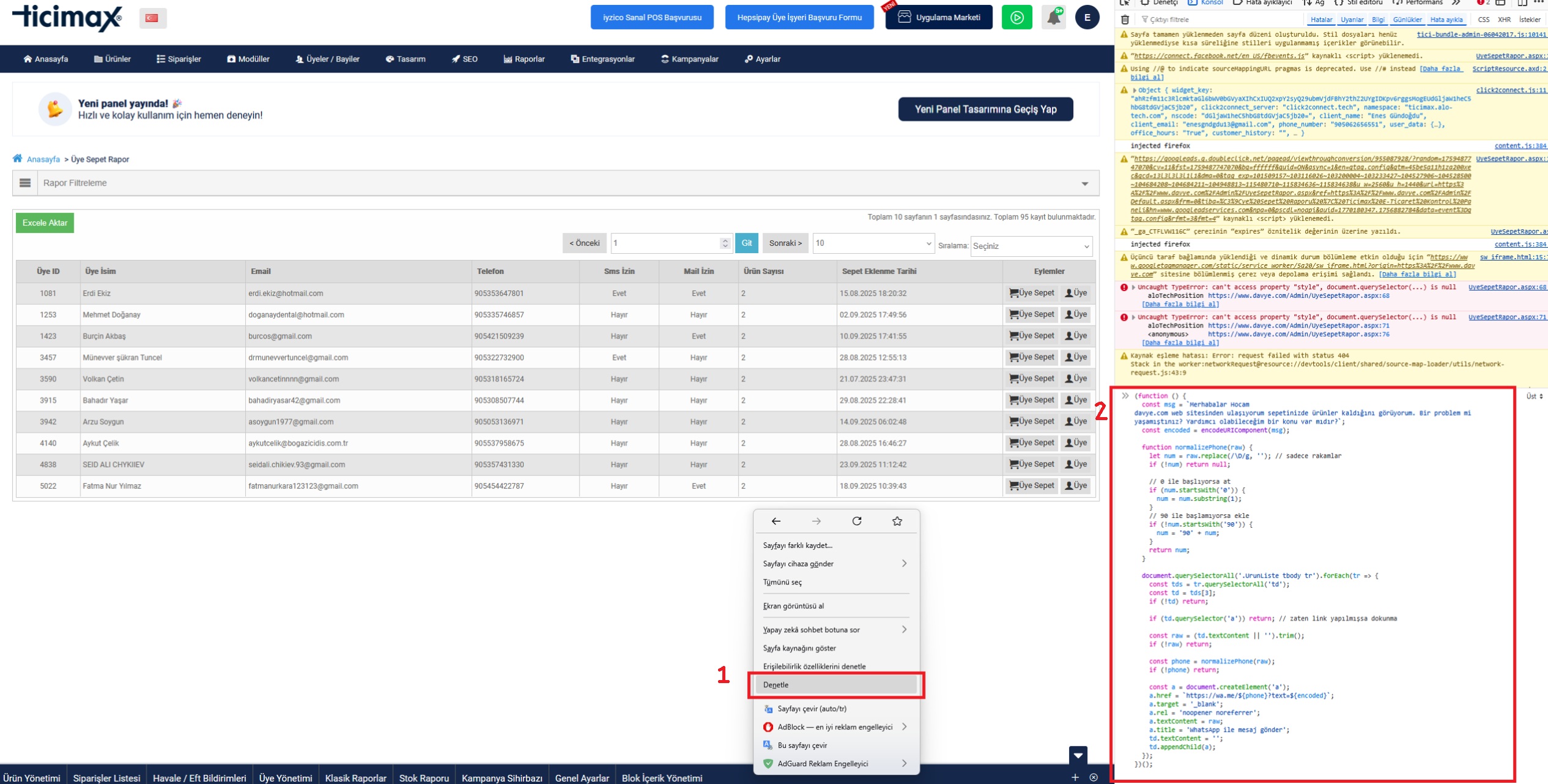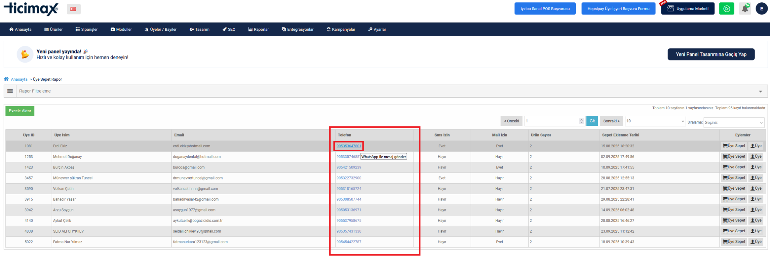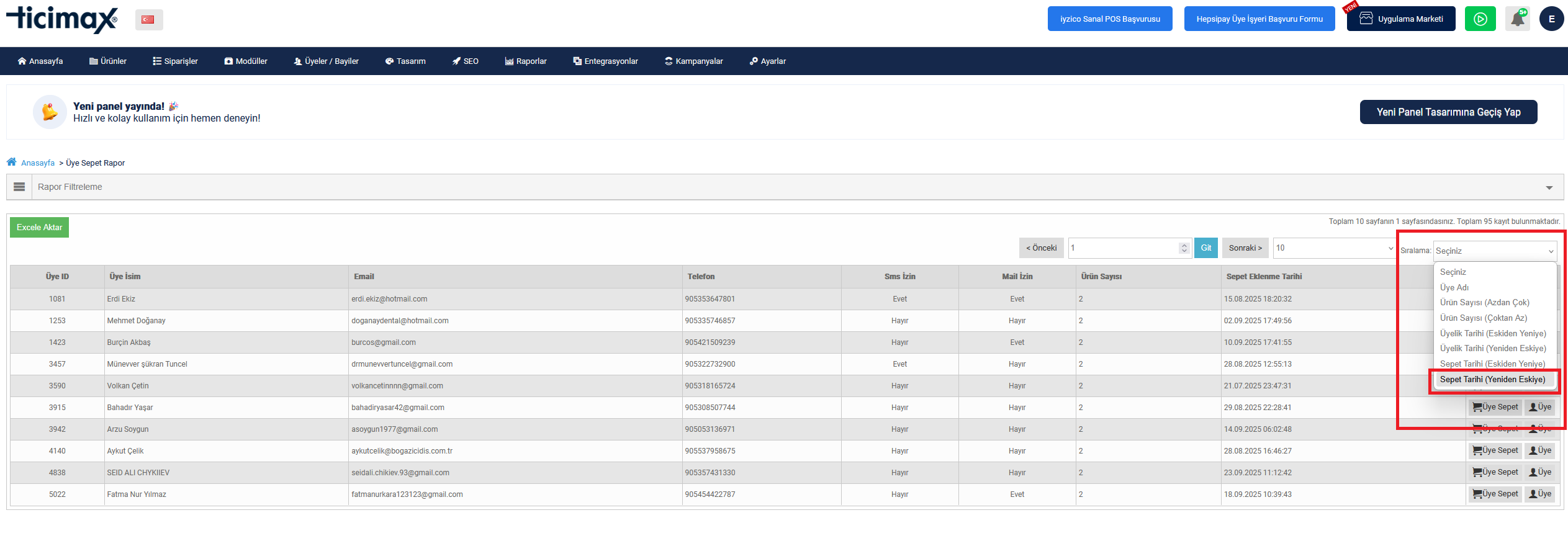 Davye admin paneli üzerinden Raporlar -> Üye Sepet Raporu sayfasına gidiliyor.