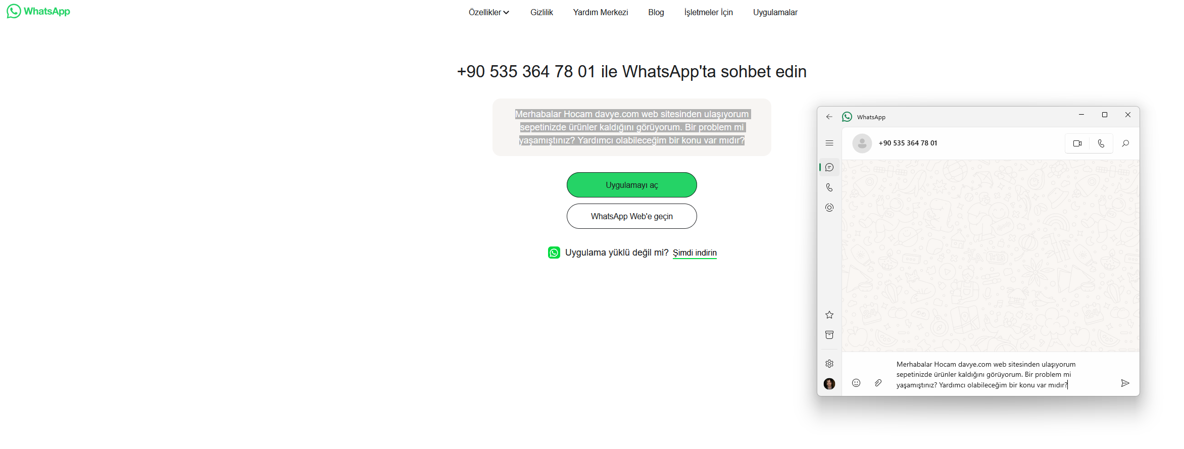 davye.com web sitesinden ulaşıyorum. Sepetinizde ürünler kaldığını görüyorum. Bir problem mi yaşamıştınız? Yardımcı olabileceğim bir konu var mıdır?`;